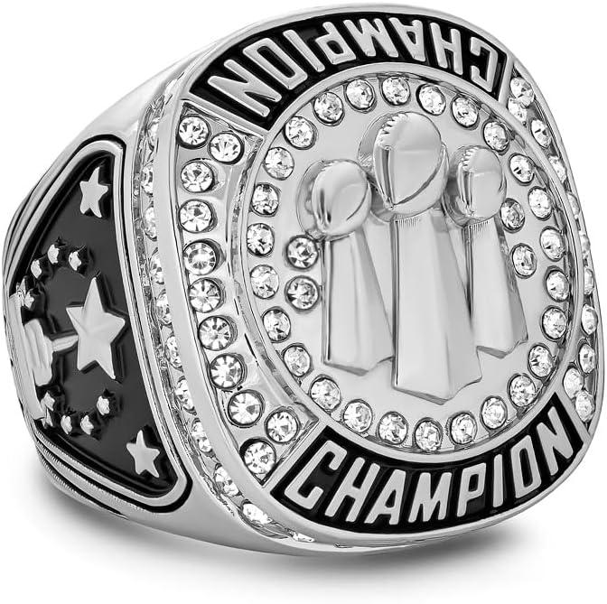 Champion Football Rings: Our Champion Rings include a 2-1/2" Diameter Black (pop open) display stand /case and a Silver Color 28 inch long neck chain giving you several different ways to proudly display the award. QUALITY: Enjoy the Beautiful Bright Silver Color Finish on these Cast Zinc Championship Rings. This is an Award you will be Proud to Present. 3 Ways to Display the Ring Trophy, they can be worn on the finger, on the neck chain, or on the stand case.
