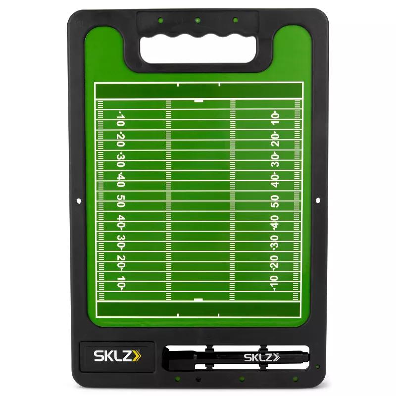 The two-sided dry erase Football Coaches Board is used for both offensive and defensive play calling. The board features a full 100-yard field on one side and a 50-yard half field on the backside for different field tactics. A blank note section is featured on the 50-yard side for coaches to give in game adjustments and plays quickly and efficiently. For ease of use, the coaches board has a built-in dry erase marker holder, included marker, and a handle for carrying on the sideline. Perfect for traveling to games and practice, it will fit in almost any bag.
