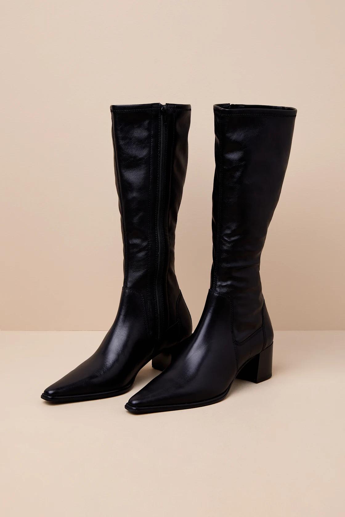 The Vagabond Giselle Black Leather Pointed-Toe Knee-High Boots will easily become your go-to footwear this season! Luxe genuine leather shapes a pointed-toe upper with a seamed vamp that rises to a flexible, 14" knee-high shaft with a 14.5" circumference. An 8" zipper at the instep allows for easy on-and-off, all atop a sleek block heel. Available in Euro sizes only.