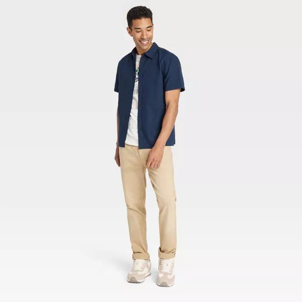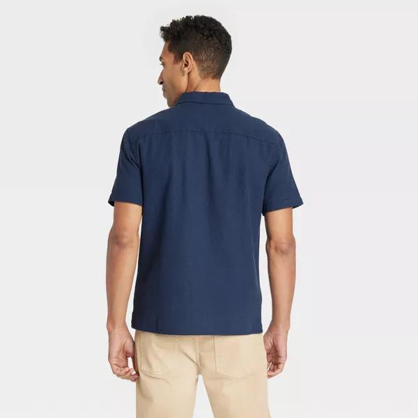 Spruce up your shirt collection with this Casual-Fit Short-Sleeve Collared Button-Down Shirt from Goodfellow & Co™. The casual-fit shirt is crafted from lightweight linen-cotton blend fabric with a below-waist length and side vents for comfortable wear. It's finished with a collared neckline, full-length button-down placket and back yoke for a classic look.