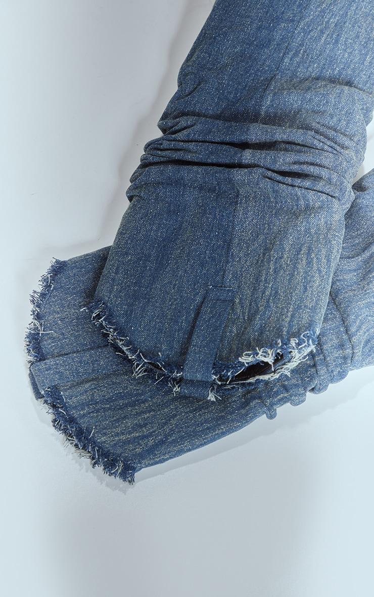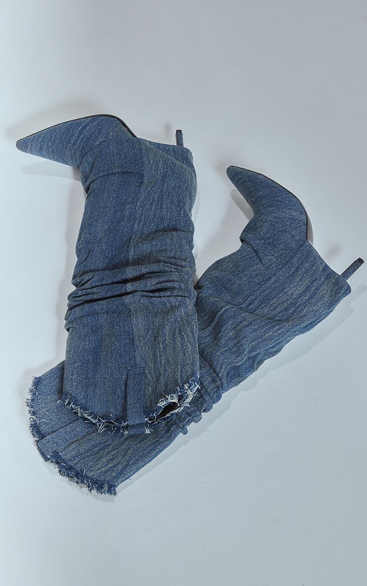Blue Washed Denim Point Toe Frayed Fold Over Knee High Heeled Boots