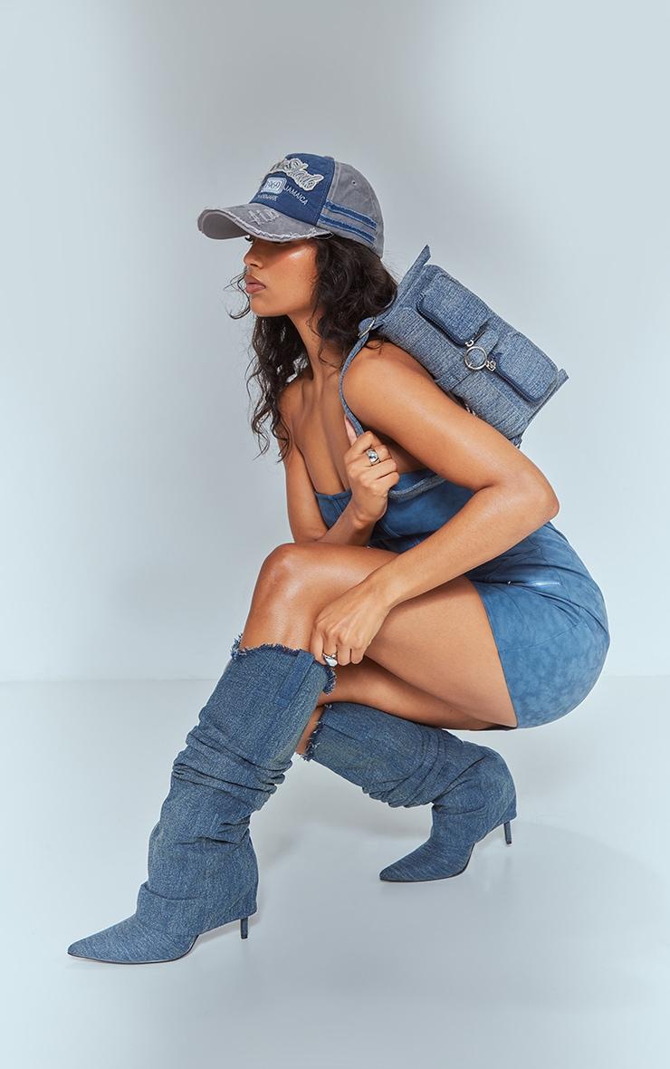 Add some edge to your look with these blue washed denim point toe frayed fold over knee high heeled boots. These boots are brought to you in a blue denim material with a pointed toe, a fray edge and a fold over design, how could you say no? These knee-high heeled boots won't let you go unnoticed. Style with your outfit of the day for a flawless finish.