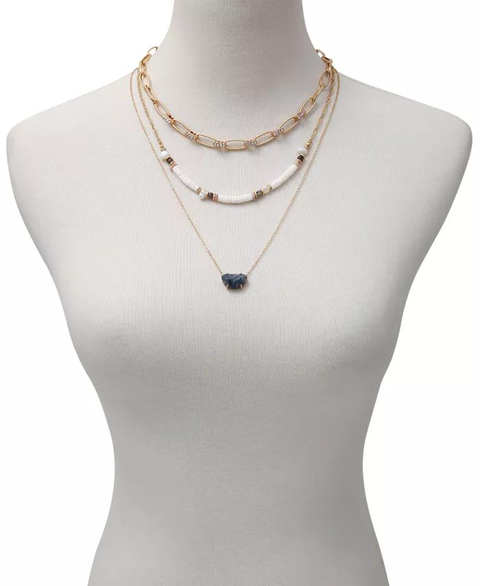 This gold-tone layered neck by T Tahari, mixes a glam crystal glass stone accented cable chain with a simple white shell chain that has freshwater imitation pearl and peach, black bead accents. Finishing it off with a gray agate pendant necklace.