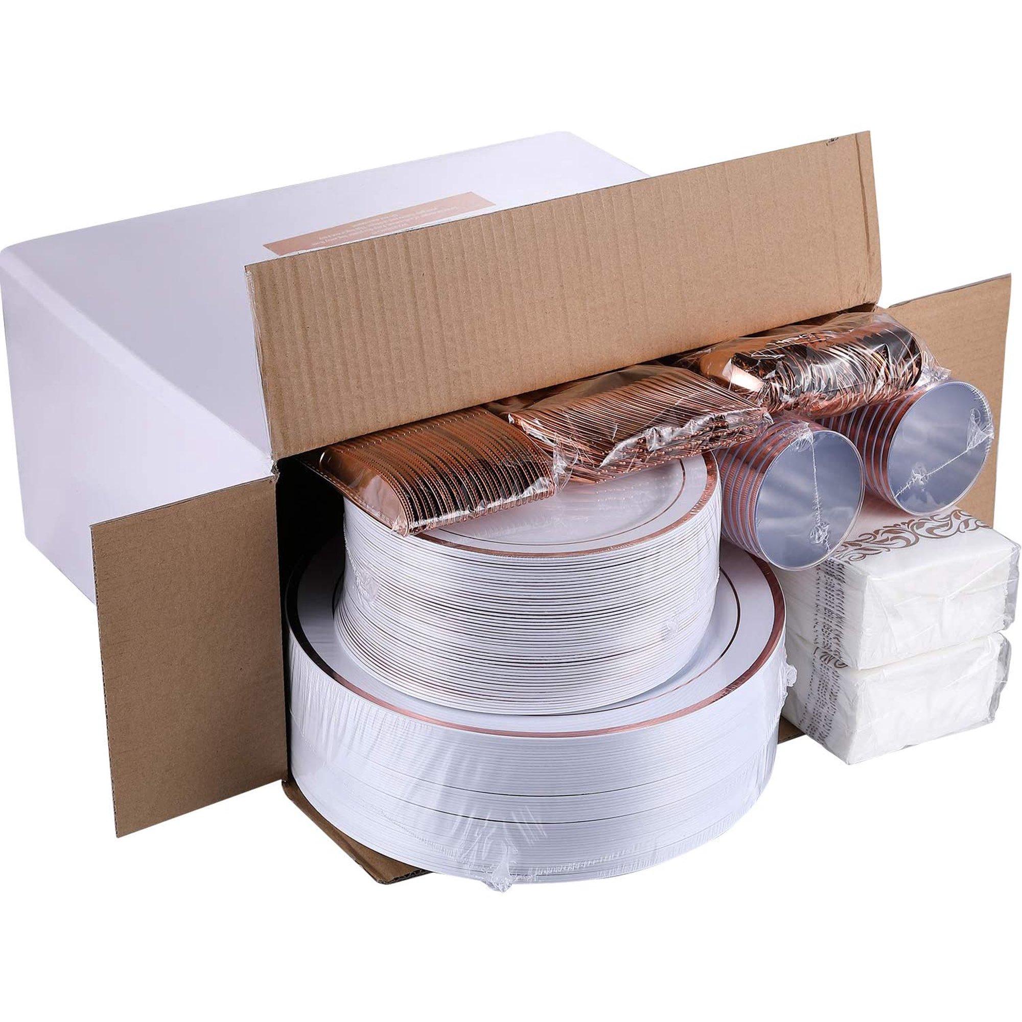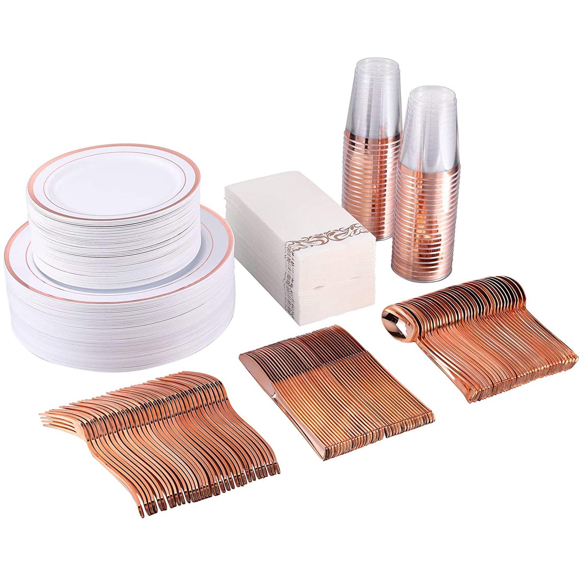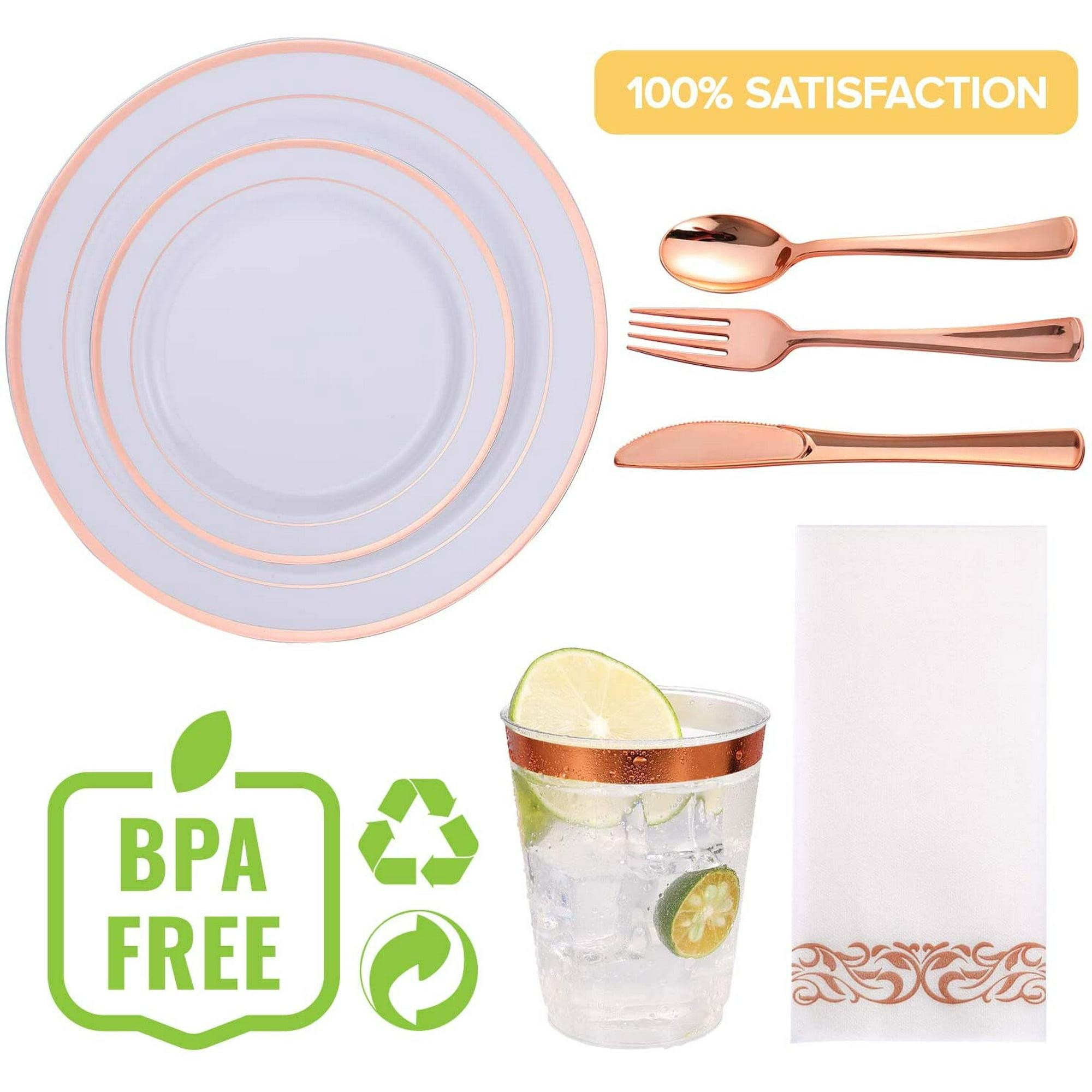 350 Piece Rose Gold Dinnerware Set 50 Guest -100 Rose Gold Plastic Plates - 50 Plastic Silverware - 50 Plastic Cups - 50 Linen Feel Paper Napkins, FOCUSLINE Disposable Dinnerware Set
