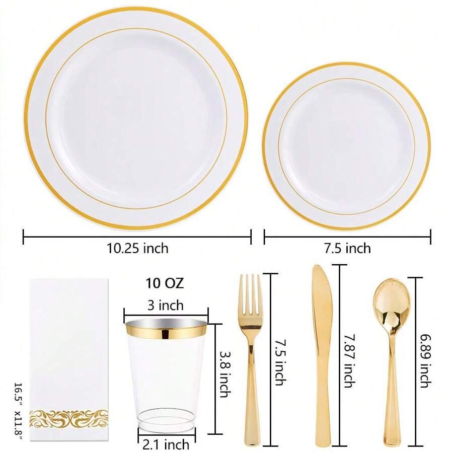 A COMPLETE KIT: Our gold plastic dinnerware contains everything you need to serve 50 guests, 50 Dinner Plates, 50 Salad Plates, 50 Forks, 50 Knives, 50 Spoons, 50Tumblers 10 oz,50 Napkins. Ideal for Thanksgiving table decor, sturdy construction resists breakage, bending, and snapping