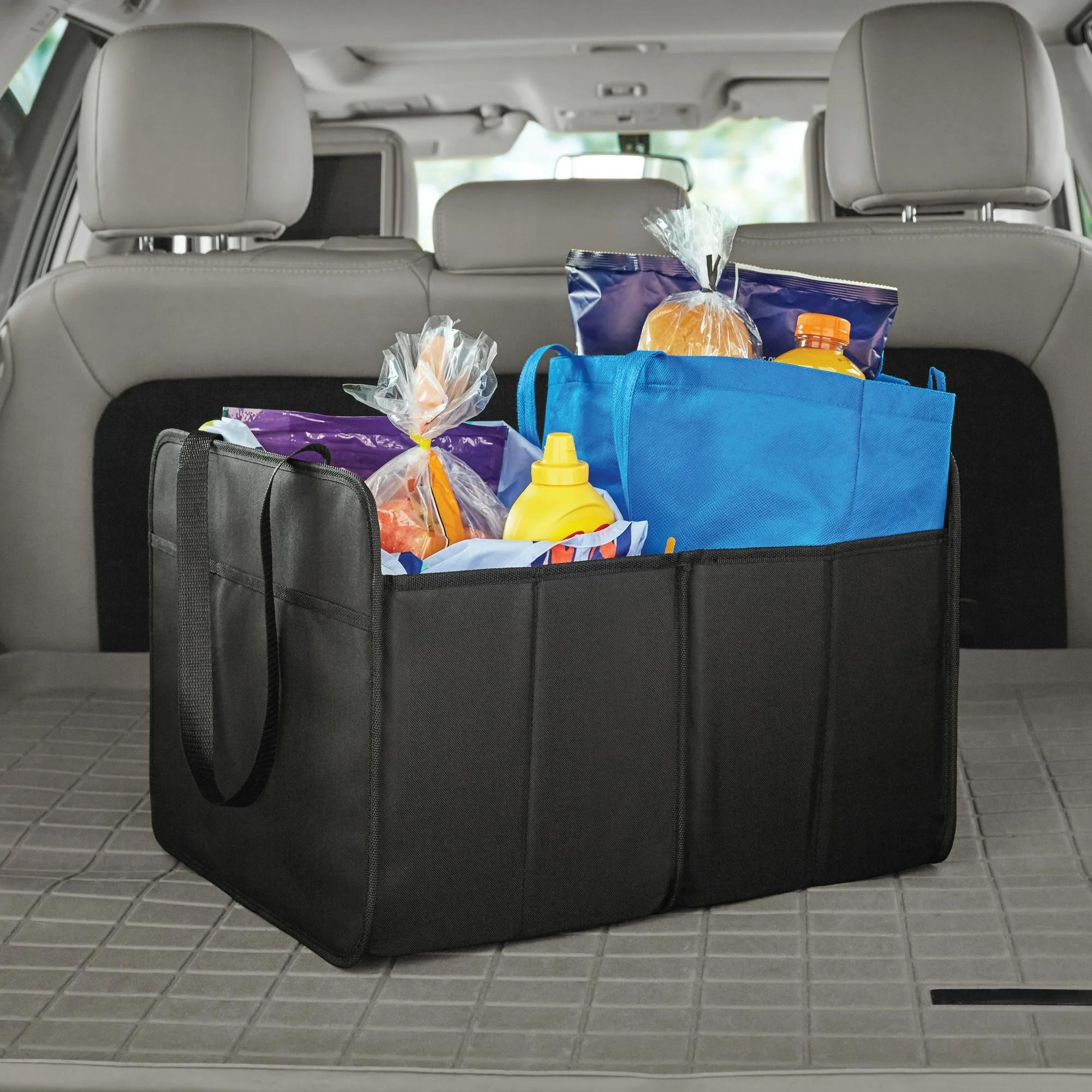Auto Drive Automotive Black Hard-Sided Collapsible Trunk Organizer 1 Pack, 18.5"x 16.54"x 9.96". This is a very useful trunk organizer that can help loading much essentials using in car road trips. It contains a large compartment that could be flexible divided into two exactly same size containers to meet your demand of loading kinds of sizes stuff for the maximal loading weight of 5 kilograms