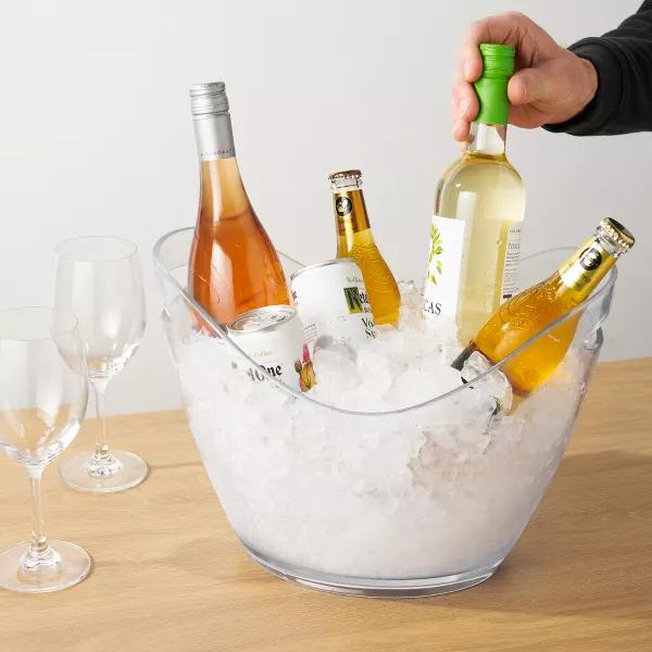 Roomy, featherlight, and stylized, this modern ice bucket comes party-ready. It’s made of durable polystyrene with cut-out handles allowing for easy mobility. Low-cut sides make it easy to swoop in and grab another bottle.