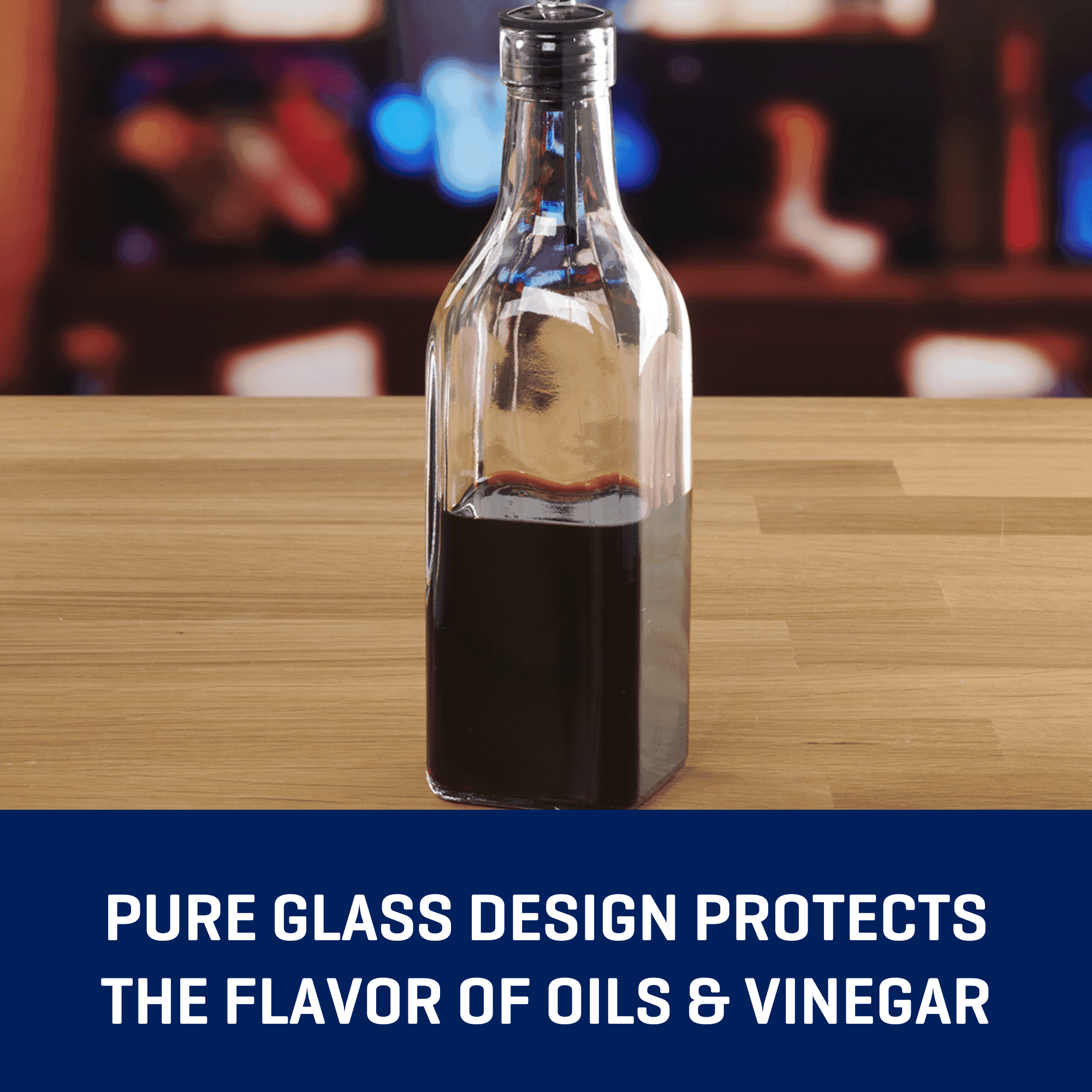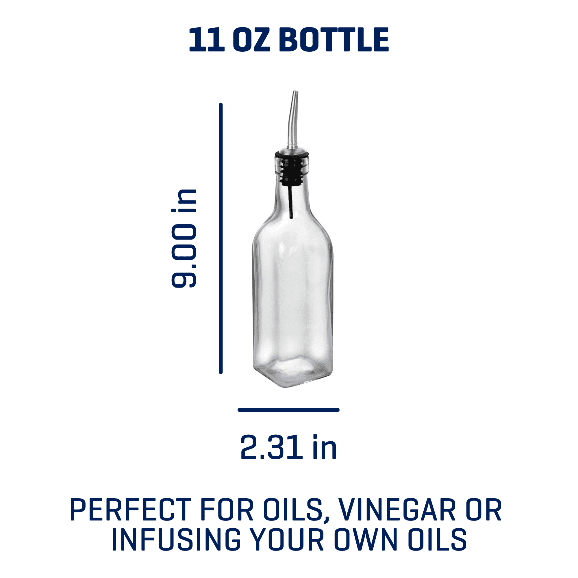 Anchor Hocking 11 oz. oil and vinegar bottle with stainless steel spout is ideal for oil, vinegar, homemade dressing for salads, and so much more. Its glass construction showcases contents for an attractive presentation on any table or countertop. The slim profile is comfortable for you to hold, while the square base allows it to stably stand on the countertop for easy reach. This bottle is dishwasher safe for extra convenience, while the spout should be washed by hand. Assembled product weight: 0.99 lbs. and product dimensions: 10.2" tall and 2.32" wide at the base.