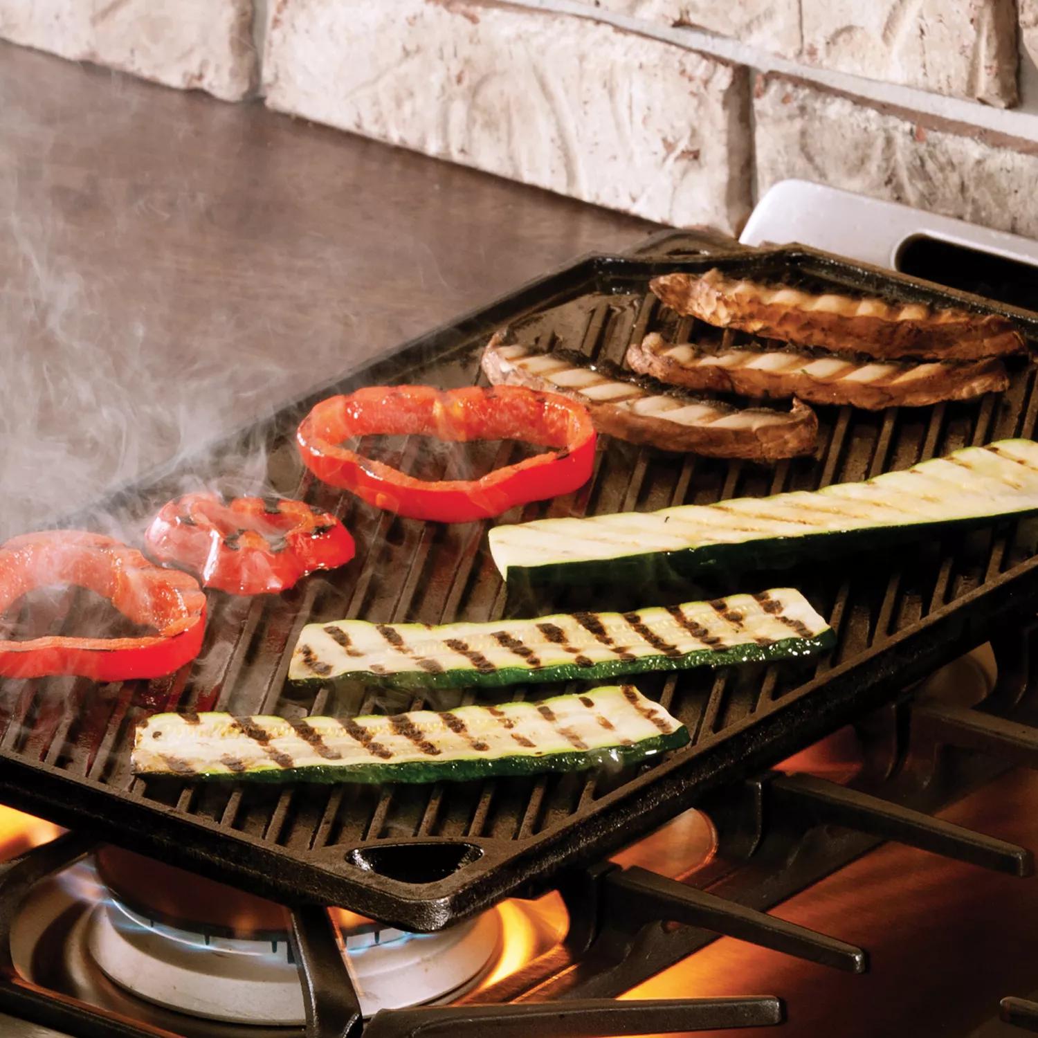 This cast iron grill and griddle combo is perfect for everything from frying up a breakfast hash to searing steaks, grilling chicken breasts and more. Whether you’re flipping pancakes or feeding a crowd of hungry tailgaters, you’ll love the way this does-it-all two-burner pan performs.
