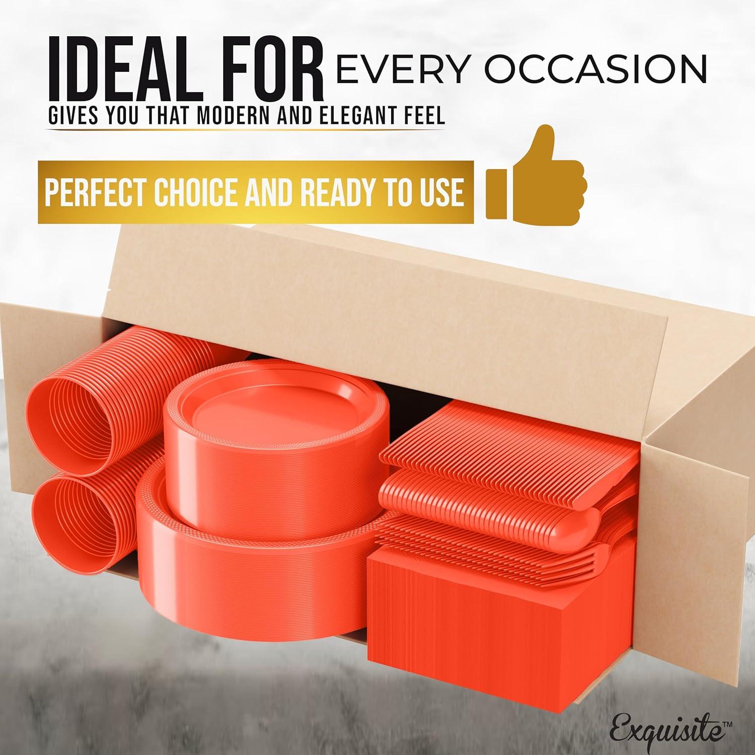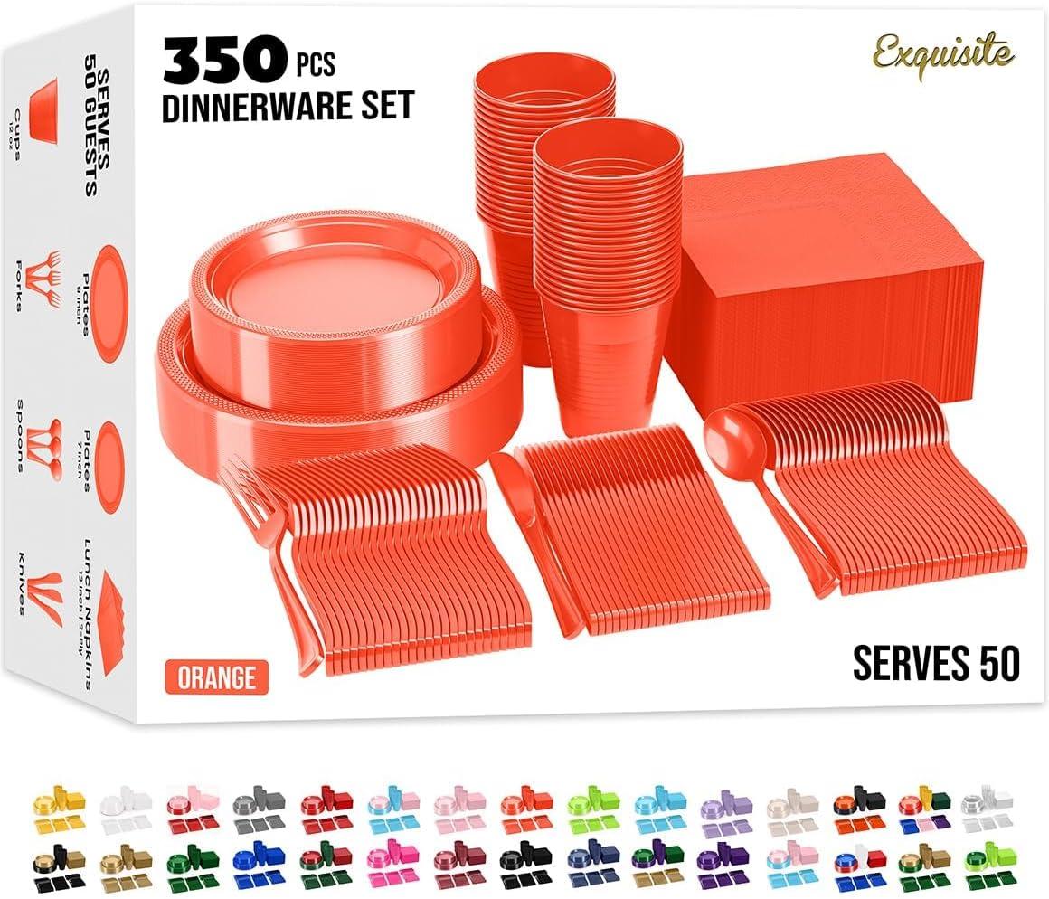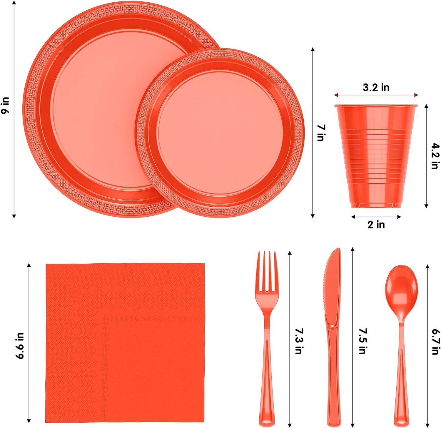 350 Pcs Plastic Dinnerware Set Includes: 50 9" Orange Plastic Dinner Plates | 50 7" Plastic Appetizer Plates | 50 Plastic Cups | 50 Paper Napkins | 50 Plastic Cutlery Spoons Forks & Knives Exquisite