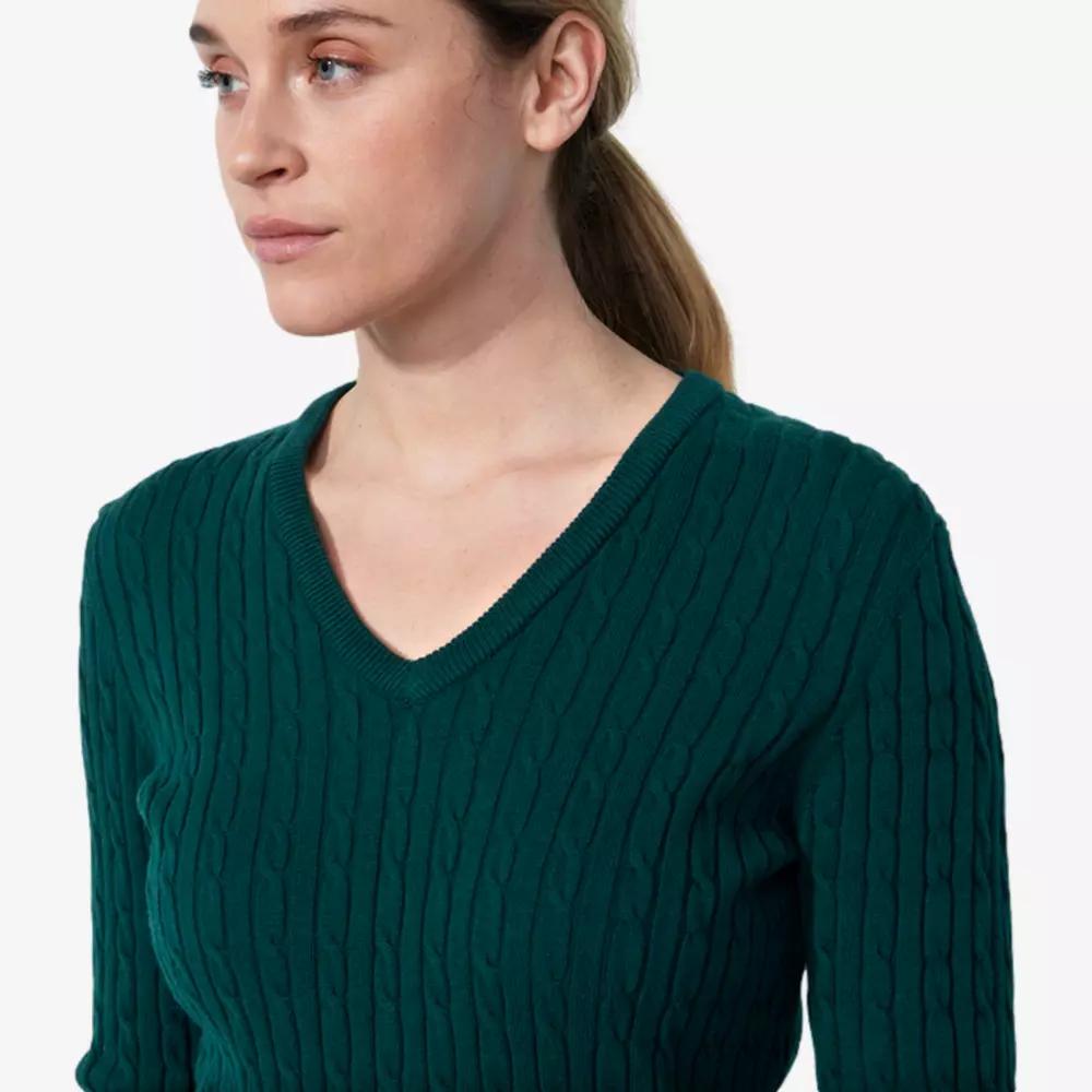 Madelene is a classic pullover sweater made from cotton and cashmere. A warm cable-knit golf top with V-neck in a preppy style that is great for everyday wear as well as the links. Details: Slim fit Long sleeves Soft Cable-knit V-neck 95% cotton, 5% cashmere
