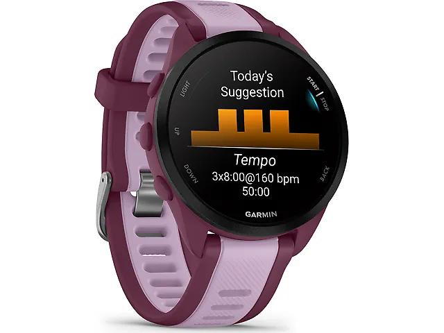 The Garmin Forerunner 165 Music is a dream watch for beginners and experienced runners alike. This GPS running watch may look simple but it's packed with cool features to keep your health and training on track. Plus, you can listen to music, audiobooks, podcasts and more on your run. The Forerunner 165 Music allows you to download up to 500 songs, plus playlists from your Spotify, Deezer or Amazon Music accounts (subscription may be required). It's like having a personal running coach on your wrist-get personalized training plans, daily suggested workouts and race adaptive training insights that change as you get better to optimize your performance. Plus, with over 25 built-in GPS and indoor sports apps, including running, cycling and strength training, you'll have everything you need to crush your goals. A vibrant 1.2" colorful AMOLED display is bright and easy to see, even in the sun. And the battery lasts up to 11 days in smartwatch mode, so you can wear it all day and still have enough juice left for your workouts. This isn't just some glorified step-counter, the Forerunner 165 features a touchscreen and buttons for easy navigation, along with built-in GPS for accurate tracking of time, distance, pace, speed and more. Smart notifications let you stay connected with your friends and get messages on the watch, while Garmin Pay™ contactless payments keep your wallet on your wrist in case you want to stop for a coffee post-run. And if you run into an emergency, safety and tracking features let you send your location to a friend for peace of mind. So whether you're signing up for your first race or want to take your running more seriously to beat your best time, the Garmin Forerunner 165 Music will be a game-changer.