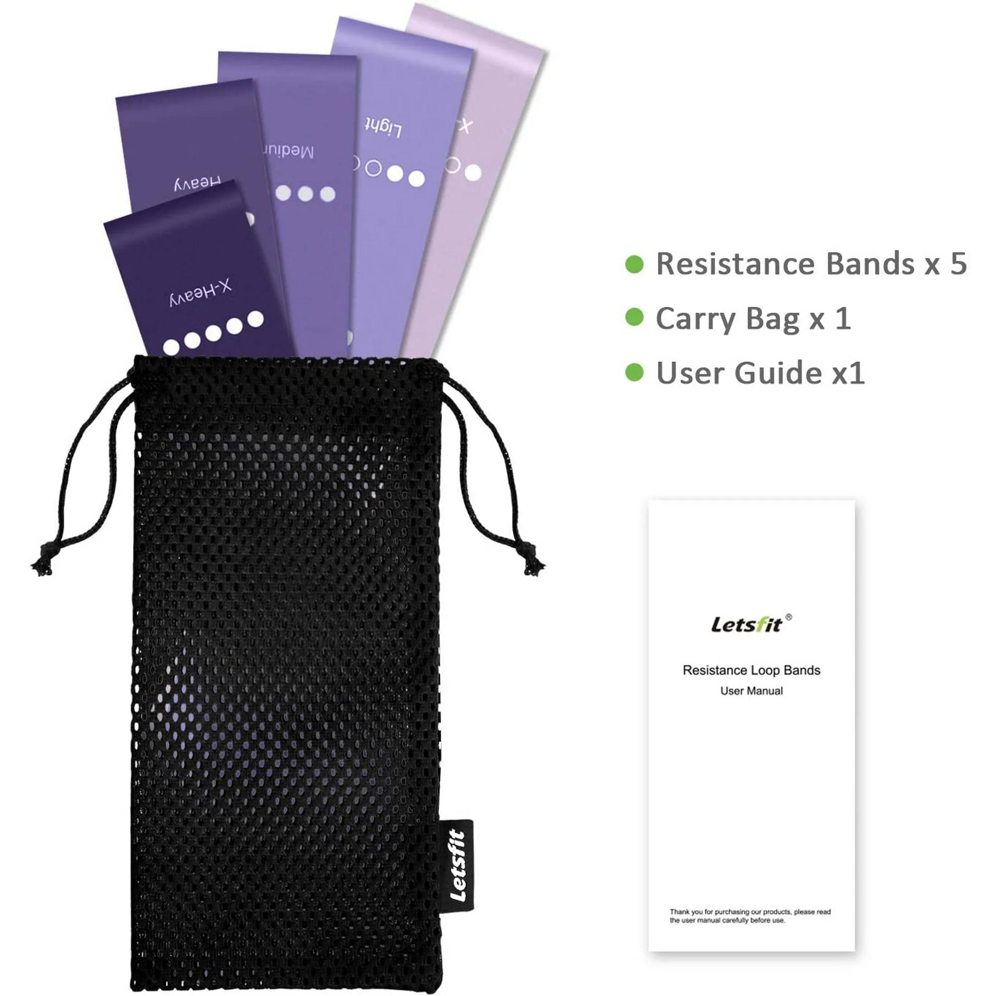 5 Resistance Bands Include: Made from 100% natural latex. Comes in 5 different resistance strength levels: X-Light, Light, Medium, Heavy and X-Heavy. They're suitable for beginner or a seasoned workout sportsman Efficient Workout: Loop Resistance Bands increase the effectiveness of your exercises. Used for a range of workouts, from glute and hip activation, strength techniques to integrate seamlessly with every workout program such as Yoga