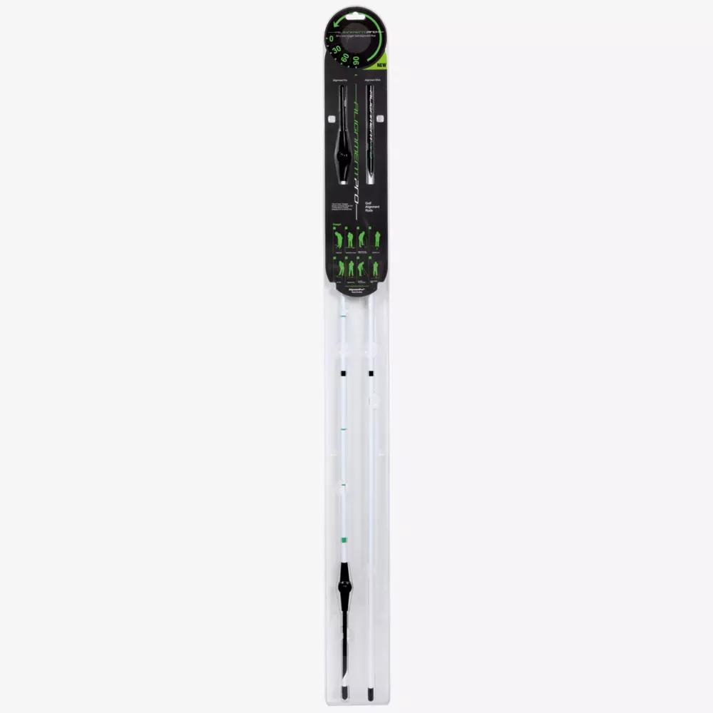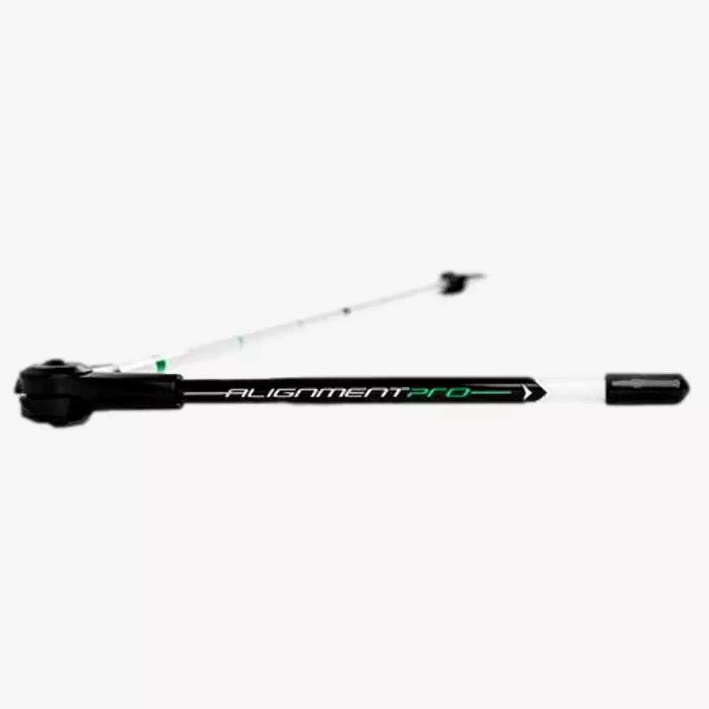 All In one "Hinged" Golf Training Aid that rotates in a smooth motion every 1 degree for putting, Chipping and Full Swing. This golf Package Includes an Alignment Pro and a regular Golf Alignment Stick. This is the only patented Alignment Stick in golf today that has two hinges on each end that rotate to 90 degrees. This allows the training aid to be used as an effective golf training tool to improve every aspect of your golf game. The best thing about it, is that its so simple yet so effective. We designed it from the highest quality materials and engineering that even the tour players are impressed with it. Best of all it fits perfectly into one of the slots in your golf bag just like a regular golf alignment stick would. Don't forget to protect your dual hinge Alignment Pro with a sleek faux leather white or black sleeve. Golf Swing Plane Being lined up is critical if a golfer wants to be accurate and hit it long and straight. The other half is ensuring that your swing is on plane. The Single Hinge Alignment Pro, the Double hinge Alignment Pro and Regular Alignment Sticks will help you develop habits that will improve your golf swing plane. Putting Seriously though your Putter should feel like your swinging through butter at impact. If it feels like you are hitting a bag of rocks then either your putter plane is off or your ball position is incorrect. Golf can be an easy game and you can make up a lot of shots if you practice your putting with this stick and avoid 3 putts. The double hinged alignment pro gives the golfer instant feedback of the proper plane the shaft should be on. This is key. By matching the guide line on the putter with the Alignment Pro, you'll know instantly if your putter is aligned properly toward the target. The Alignment Pro is the only tool of it's kind that, since the stick is ABOVE the ball, you're able to perfectly align the club and ball while putting. By practicing this way, your ability to putt straight every time will quickly increase. Also, by using the markings on the Alignment Pro, you'll become more aware of how far back you should bring the club in your putting back swing. This will dramatically improve your feel for distance on the putting green. Short Game Instant Feedback: A challenge golfers face is bringing their club 'inside' when they are chipping. In other words, their backswing is too much behind them. The Alignment Pro prevents this by creating a barrier so, if the backswing is incorrect, the club will make contact. By also using the Alignment Stick, the golfer will be able to instantly see if his or her club is going through the ball at the right angle. Control your Chipping: Many golfers lose control when chipping. This is often a result from the angle and arc of their backswings. With your Alignment Pro, your chipping will be more accurate through controlled movement and alignment. You can set up 'swing gates.' This will ensure that you're backswing is at the correct angle and arc. Keeping Knee Bent: By using the Alignment Pro as a guide against the golfer's knee, it will prevent golfers from swaying or moving their back knee. Most importantly it will keep your right knee bent which is important in the golf swing. A bent knee keeps you from losing stability and power. This small improvement will immediately increase the golfer's accuracy as he or she makes contact with the ball. Chipping Alignment: Golfers frequently chip with their feet slightly open toward the target. You can set your Alignment Pro to help you simultaneously align your feet correctly and maintain the correct club angle for your swing.