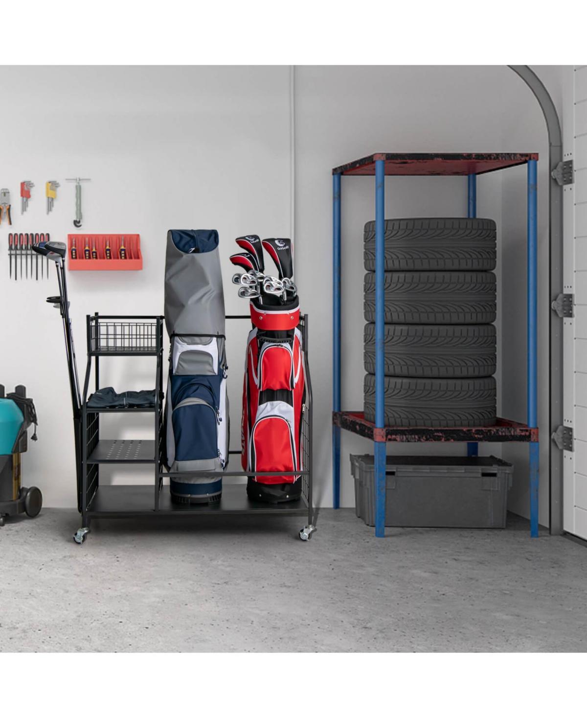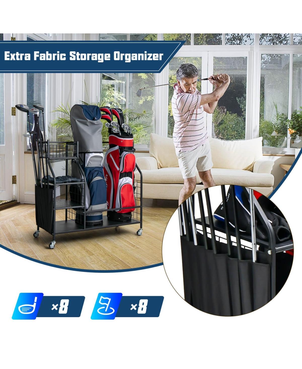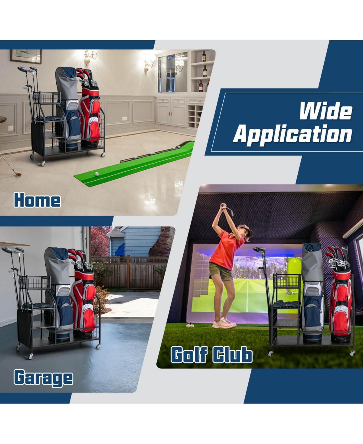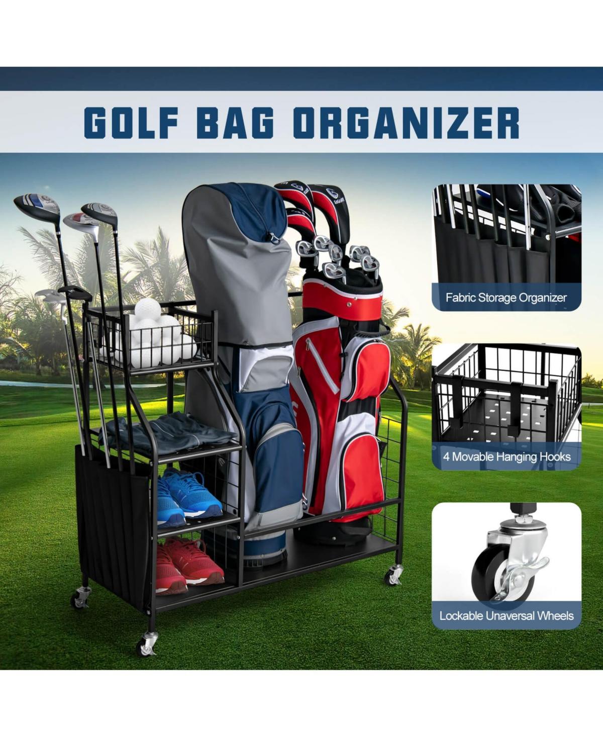This multifunctional golf bag organizer accommodates 2 standard golf bags, with a storage basket for golf balls, shelves for equipment, and a fabric organizer for clubs. It features lockable wheels, a sturdy metal frame, and is perfect for both indoor and outdoor use.